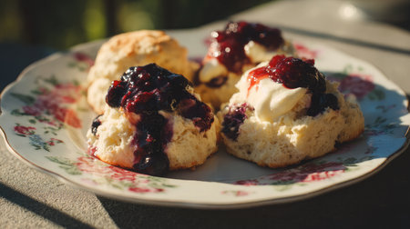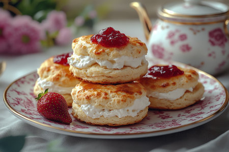 This charming image captures freshly baked scones topped with jam and cream, served on an elegant floral plate, evoking a cozy tea time atmosphere.