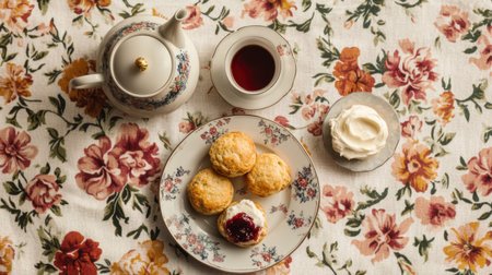 A top-down view of a cozy tea setup with a teapot, teacup, and a plate of scones with clotted cream and jam, all on a floral tablecloth.