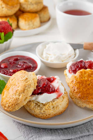 Delicious scones with Strawberry Jam and Clotted Cream on white table. English pastries concept. A scone is a single-serving quick bread, usually made of wheat, barley or oatmeal with baking powder.