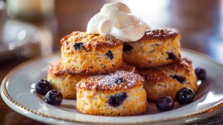 A plate of goldenbrown scones studded with wild blueberries and served with a dollop of whipped cream