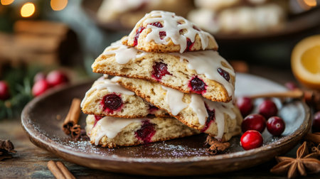 Delicious cranberry scones with icing on a rustic plate surrounded by festive decorations