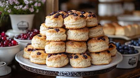 Delicious freshly baked scones topped with blueberries and cranberries arranged on a decorative cake stand. Generative AI