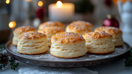 Delicious freshly baked biscuits arranged on a rustic tray with warm candlelight in the background. Generative AI