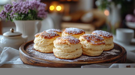 Freshly baked scones on a wooden platter with powdered sugar and flowers in a cozy kitchen setting. Generative AI