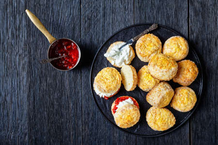 English Style Scones with clotted cream and strawberry jam on a black plate, horizontal view from above, close-up, flat lay
