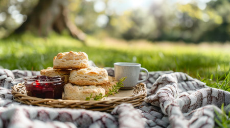 Enjoy a beautifully arranged morning picnic featuring fresh-baked biscuits, homemade jam, and delicate flowers in a serene green landscape. A cozy table setting invites relaxation.