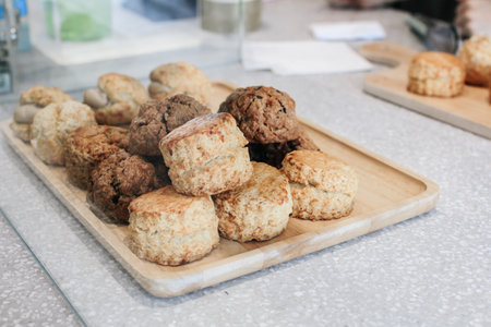 Freshly baked scones displayed on rustic wooden counter at a charming bakery in the morning sunshine. Generative AI