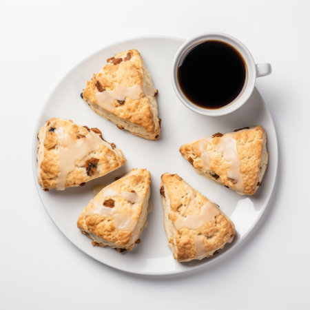 fresh homemade scones and a cup of coffee on a white background. this associated press-style photo is digitally enhanced, showcasing the dark brown and amber tones. shot with a fujifilm provia, the image captures the symmetrical asymmetry of the applecore. ai generated