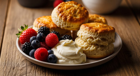 Scones with Assorted Berries and Cream on Plate