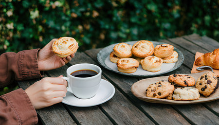 table setting with scones, muffins, and tea for cozy afternoon treat, created with generative ai