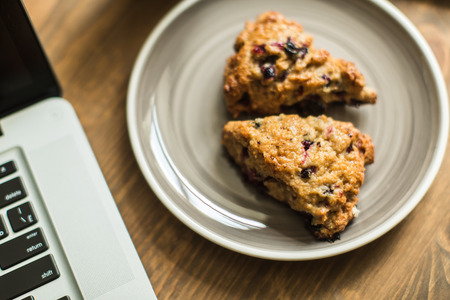 workplace with computer and home-made cakes