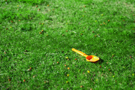 Children's toy shovel for a sandbox on a yellow background