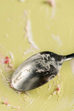 Metal spoon on the dirty plate with cream pie leftovers.