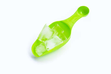 Ice cubes in green ice scoop.