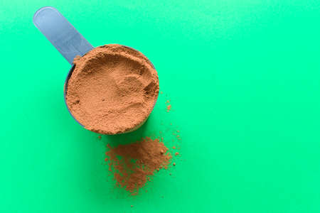 Spoon with chocolate protein powder. Green background, top view.