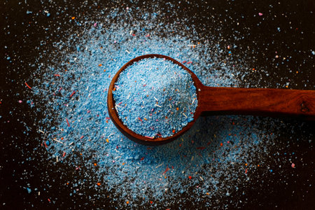 Washing powder in plastic spoon on blue background
