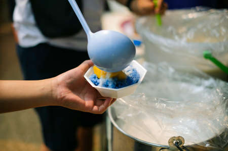 Hands of volunteers serves free food to the poor and needy in the city : The poor people bring a container to scoop food to eat and relieve hunger and bring home
