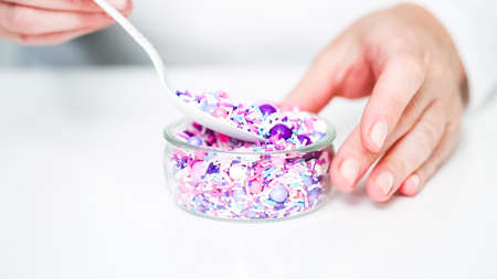 Colourful Sugar sprinkles in measuring cups. Decoration for cake and ice-cream and cookies. Top view, Flat lay on wooden background.