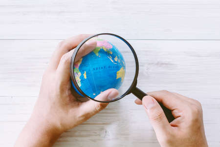 Hand holding model of the globe on wooden background
