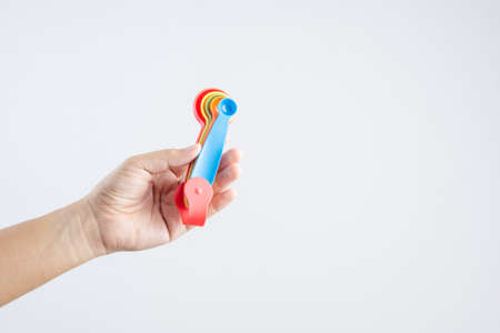 Hand holding set of measuring spoons made of colored plastic on white background
