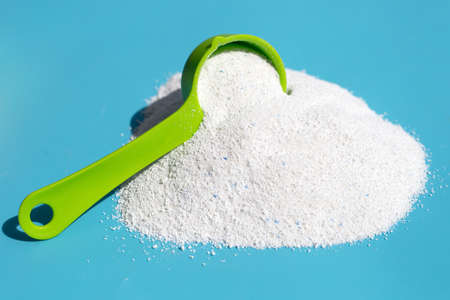 Detergent powder with measuring spoon for clothes washing. Laundry concept.