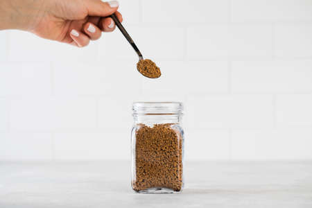A womans hand holds a small spoon with instant coffee over a glass jar with coffee.