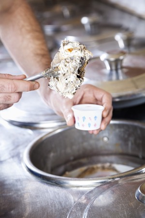 Closeup of seller's hands filling butterscotch ice cream with spatula in cup at parlor