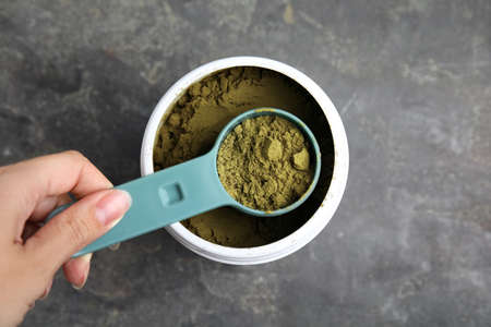 Closeup photo of wooden scoop with green tea in human hand isolated on white. Shallow focus.