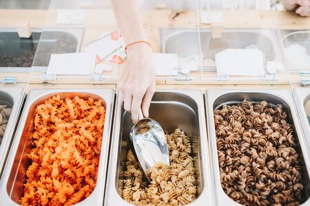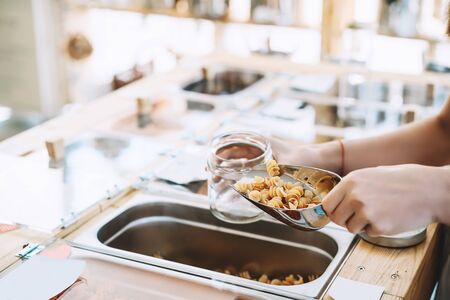 Bulk products in zero waste shop. Woman buying dry goods in plastic free grocery store. Girl with cotton bag and glass jars makes conscious shopping. Sustainable small businesses. Minimalist lifestyle