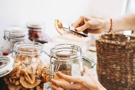 Woman with glass jars buying dried berries and fruits in zero waste shop. Sustainable shopping in plastic free grocery store. Minimalist lifestyle of vegan young girl with white reusable cotton bag