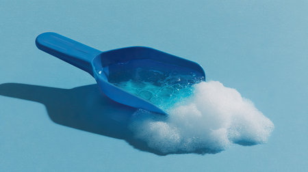 This image features a bright blue scoop resting on a light blue surface, filled with soap bubbles and foam, symbolizing cleanliness and freshness in household chores.