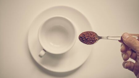 Glass jar with coffee in a hand. A hand holds a spoon full of instant coffee. Pile of instant coffee grains in metal spoon over glass jar. Caffeine drink. View from above. Selective focus. Close-up.