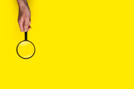 female hand holds a magnifying glass loupe on a yellow background.