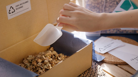Cat litter litter on a blue scoop in the hand of a Caucasian woman.