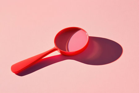 Red magnifying glass on a pink background casting a soft shadow, symbolizing focus, analysis, and curiosity in a modern minimalist style