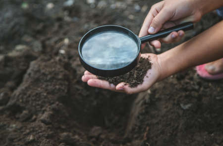 Hand of little girl holding magnifying glass examinine plant on dirt.