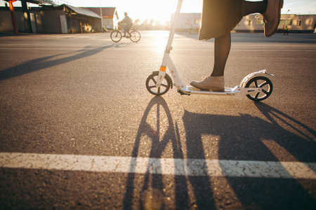 close up of Girl with kick scooter on sidewalk in summer, healthy lifestyle. female legs in white sneakers