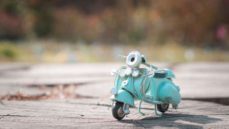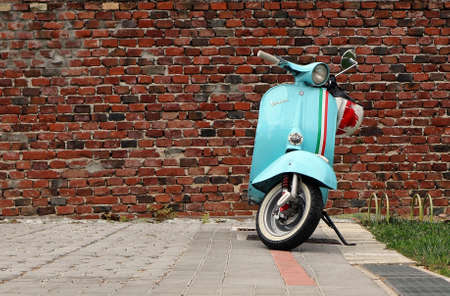 Udine, Italy. May 14 2019. An iconic vintage blue Vespa scooter parked. Old brick wall on background