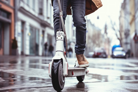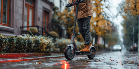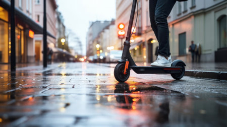 City dweller rides an electric scooter on a wet urban street, reflecting a modern eco-friendly lifestyle