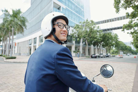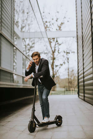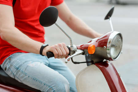 Happy owner of the modern scooter smiling cheerfully outdoors