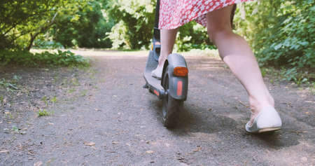 Woman in dress starts moving on electric scooter along path in the park. Kicks off the ground with his foot. Back view, spring summer, daytime, green trees through the foliage the sun shines.