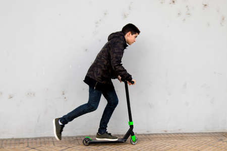 Seville Spain September 18, 2021 People rolling with an electric scooter in the streets of Seville, operating with a small utility internal combustion engines and a deck in the center