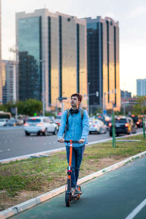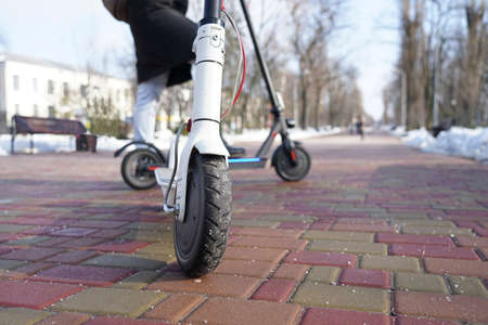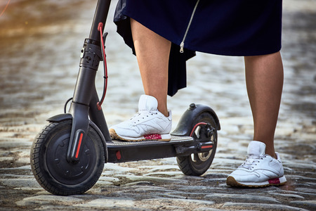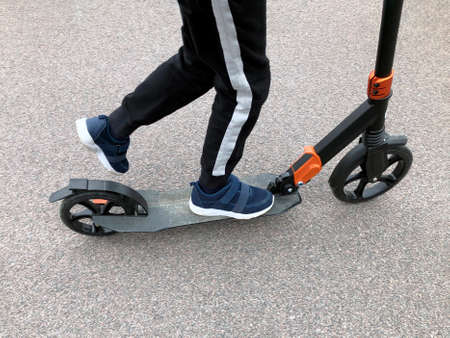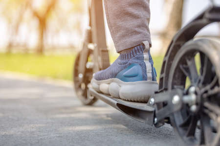 close-up of a man rides an electric scooter, on a city road, his leg stands on a scooter