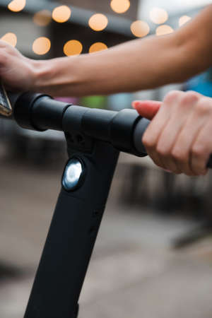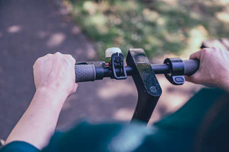 Woman's hand holding the steering wheel of a black electronic scooter on the background of the urban asphalt. Driving through the park.