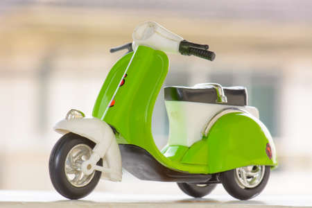 Classic vintage scooter with a yellow and turquoise design against a solid green background