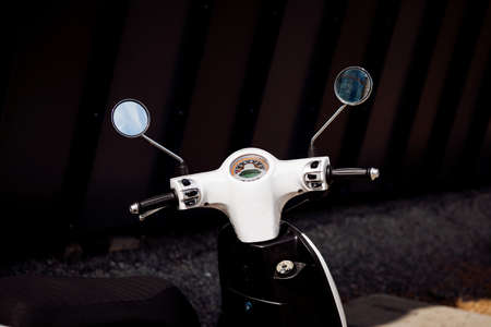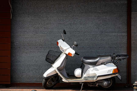 A vintage white motorcycle, moped stands in a parking against the backdrop of gray wall. Side view