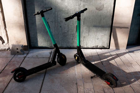 Two kick scooters parked near beige wall full covered with Parthenocissus quinquefolia, known as Victoria creeper, five-leaved ivy. Eco-friendly transport for urban life. Modern lifestyle.