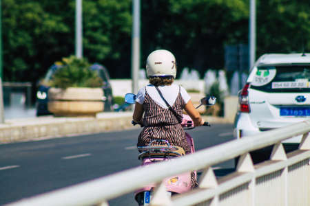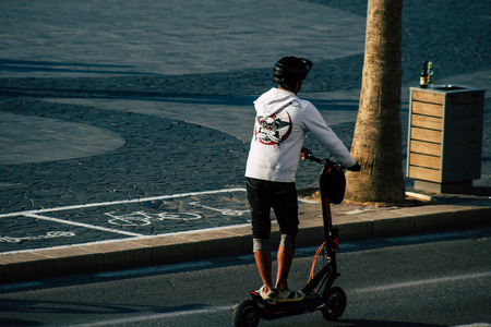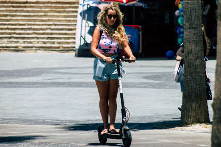 Tel Aviv Israel July 15, 2019 View of unknown Israeli people rolling with a electric scooter in the streets of Tel Aviv in the afternoon
