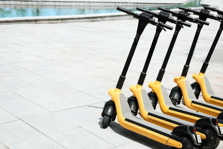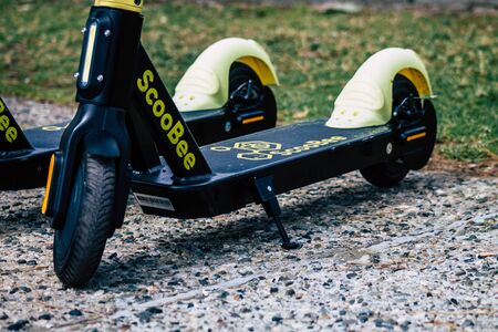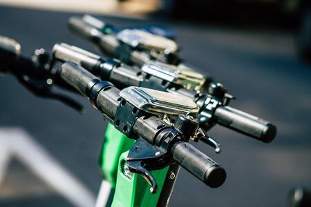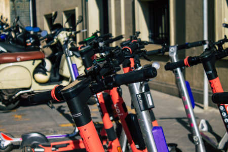 Limassol Cyprus March 20, 2020 View of electric scooters parked in the streets of Limassol in the afternoon