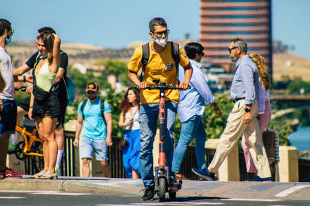 Seville Spain July 06, 2021 People rolling with an electric scooter in the streets of Seville, operating with a small utility internal combustion engines and a deck in the center